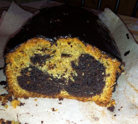 A vajat a cukorral és a tojásokkal és a tejjel habosra keverem. A lisztet a sütőporral, a sóval összekeverem, majd összekeverem a tojásos masszával. Amikor ez készen van a massza felét átkanalazom egy másik edénybe majd hozzáadom a kakaót. Gyümölcskenyérformába öntöm a „sárga” masszát, majd belekanalazom a „barnát” is úgy hogy egy kicsit összekeverem a sárgával. Majd a maradék masszát a tetejére öntöm. Előmelegített sütőben 170’C-n 50 percig sütöm. Ha kihűlt a tetejét csoki mázzal borítom.