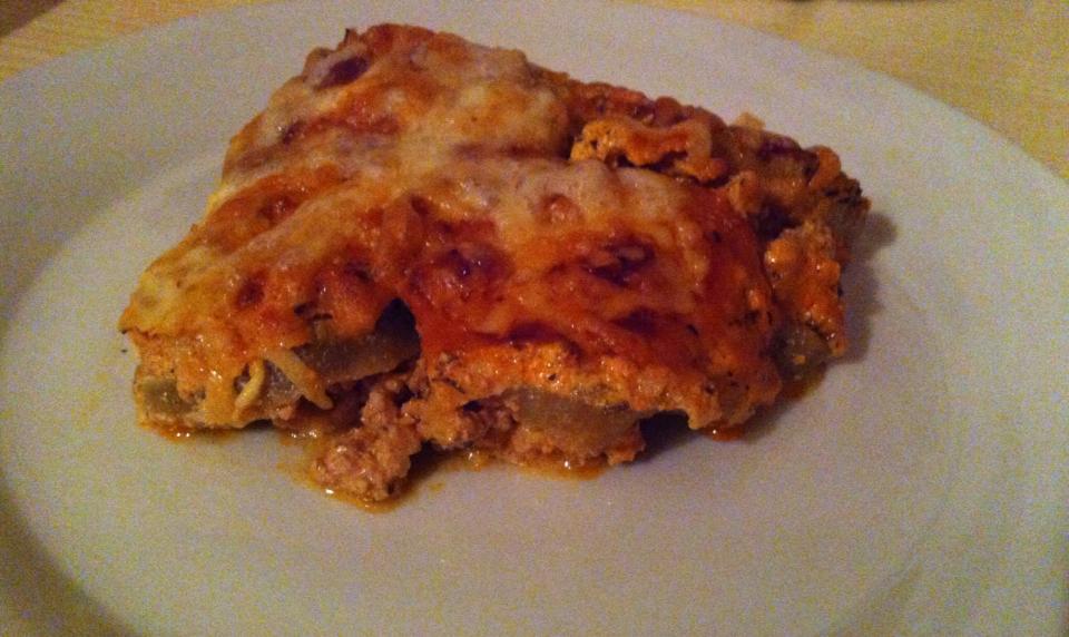 A húst a paradicsomsűrítménnyel és a fűszerekkel félig összefőzöm, majd a legvégén hozzáadom a tejfölt. Amig fő a hús, addig megpucolom a padlizsánt és vékony szeletekre vágom. Egy üvegedény aljára rakok egy sor padlizsánt, majd mehet rá a hús és végül még egy sor padlizsán. Letakarom és megy a sütőbe. Majd amikor félig megsült leveszem a fóliát és megszórom a tetejét sajttal, és szép aranybarnára sütöm.