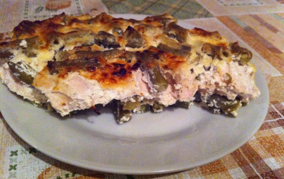 A csirkemellett felszeletelem és fűszerezem. Egy üvegedény aljába rakok egy réteg babot, majd a szeletekre vágott csirkemellet és végül még egy réteg babot. Ráöntöm a tejfölt és már mehet is a sütőbe. Kb 35-40 perc alatt kész